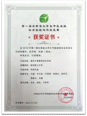大学生节能减排社会实践与科技竞赛选拔赛一等奖。