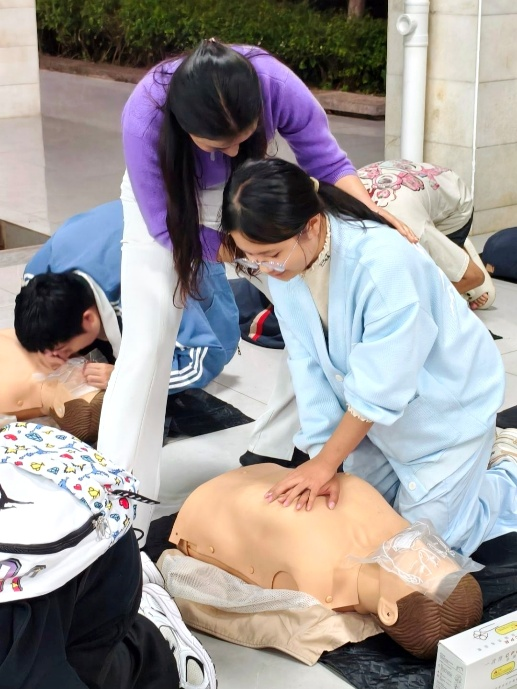 理论讲解结束后,同学们分组进行实操演练。在医生的“一对一”指导下,大家两两配合,练习胸外按压、人工呼吸、AED使用等关键步骤。从判断意识到开放气道,从按压深度到电极片粘贴,每一个细节都在反复练习中得以规范。现场气氛热烈,同学们在动手实践中真正掌握了急救技能。