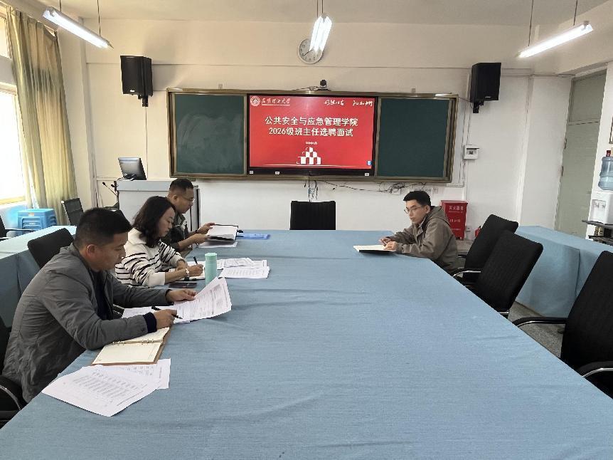 为进一步强化学生教育管理,提升人才培养质量,应急学院于3月26日在主楼408会议室开展2026级本科生班主任选聘工作,学院党委副书记、辅导员及系主任担任本次选聘评委,相关报名教师参与选聘环节。